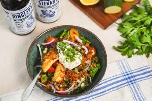 En matig, ljummen sallad är en riktig vardagshjälte mitt i veckan. Hemligheten bakom denna härliga halloumisallad med pärlcouscous är riven och knaperstekt halloumi som stekts