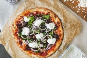 Snabb vardagslyx på färdiggräddad pizzabotten! Kryddig lammfärs möter riven halloumi, oliver och rödlök. Toppa med örtig rucola och tzatziki – klart på nolltid och älskat