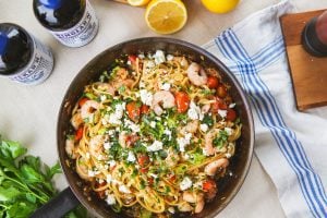 Servera en ”kan-jag-ta-om”-pasta. I den här scampipastan möts hetta från chili, krämighet från fetaost och frisk citron, toppat med persilja och rikligt med olivolja. Romantisk