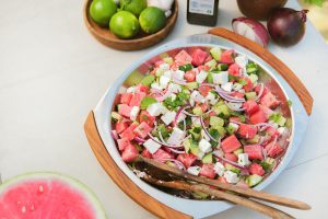 Söt, salt och somrig – allt i en tugga. Saftig vattenmelon möter krämig fetaost i en frisk och läskande kombination. Tillsammans med mynta och röd