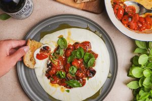 Bjud på en krämig och fräsch aptitretare som smakar Grekland. Vispad fetaost med söta rostade tomater, färsk basilika och gyllene bröd. Gott till grillat eller