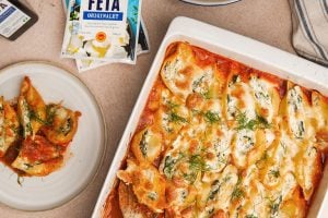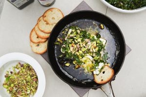 Grillad fetaost blir extra ljuvlig med en härlig chimichurri på persilja, vitlök och balsamvinäger. Strö över rostade pistagenötter för härligt crunch och servera med crostinis.