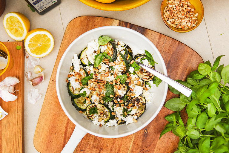 Här möter saftiga grillade zucchiniskivor en zesty citrondressing, krämig feta, rostade pinjenötter och färsk basilika. Servera som ett smakrikt tillbehör eller låt det bli en hel middag – komplettera med gott bröd och vår krämiga hummus.