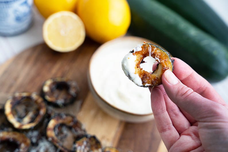 Ugnsrostade zucchiniringar med gyllene yta och smak av vitlök och parmesan blir ett perfekt litet tilltugg. Servera med en krämig fetadipp som balanserar det krispiga med sälta och syra. Passar lika bra som snacks som tillbehör till middagen.