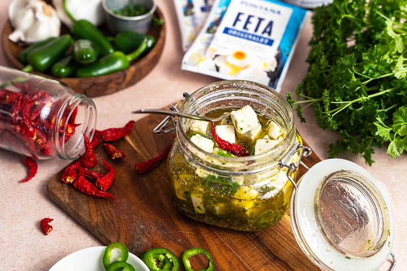 Fetaost i kuber som får ligga och dra i olivolja, chili och oregano utvecklar både smak och karaktär. Jalapeño och persilja ger frisk hetta och färg. Perfekt att förbereda i förväg och ställa fram som en del av en mezebricka eller enkel plockmiddag.